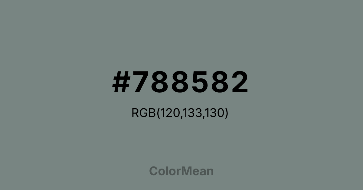#788582 RGB value is (120, 133, 130). The hex color red value is 120, green is 133, and blue is 130. Its HSL format shows a hue of 166°, saturation of 5 percent, and lightness of 50 percent. The CMYK process values are 10 percent, 0 percent, 2 percent, 48 percent.