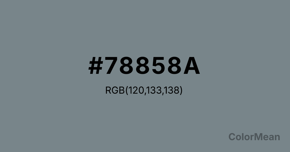 #78858A RGB value is (120, 133, 138). The hex color red value is 120, green is 133, and blue is 138. Its HSL format shows a hue of 197°, saturation of 7 percent, and lightness of 51 percent. The CMYK process values are 13 percent, 4 percent, 0 percent, 46 percent.