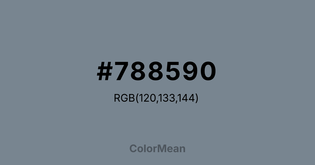 #788590 RGB value is (120, 133, 144). The hex color red value is 120, green is 133, and blue is 144. Its HSL format shows a hue of 207°, saturation of 10 percent, and lightness of 52 percent. The CMYK process values are 17 percent, 8 percent, 0 percent, 44 percent.
