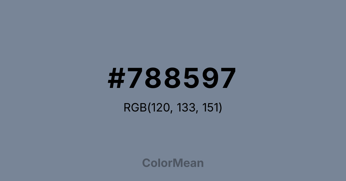 #788597 RGB value is (120, 133, 151). The hex color red value is 120, green is 133, and blue is 151. Its HSL format shows a hue of 215°, saturation of 13 percent, and lightness of 53 percent. The CMYK process values are 21 percent, 12 percent, 0 percent, 41 percent.