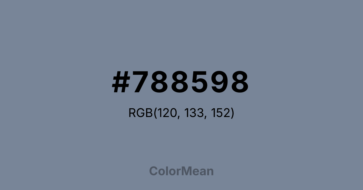 #788598 RGB value is (120, 133, 152). The hex color red value is 120, green is 133, and blue is 152. Its HSL format shows a hue of 216°, saturation of 13 percent, and lightness of 53 percent. The CMYK process values are 21 percent, 12 percent, 0 percent, 40 percent.