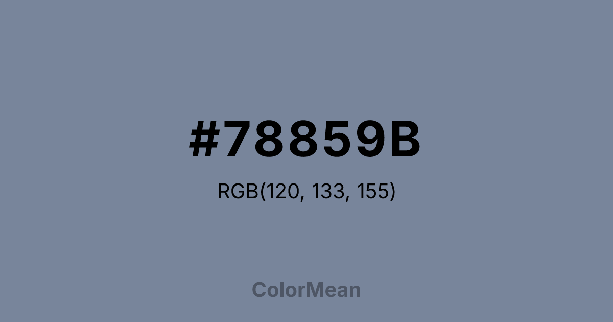 #78859B RGB value is (120, 133, 155). The hex color red value is 120, green is 133, and blue is 155. Its HSL format shows a hue of 218°, saturation of 15 percent, and lightness of 54 percent. The CMYK process values are 23 percent, 14 percent, 0 percent, 39 percent.
