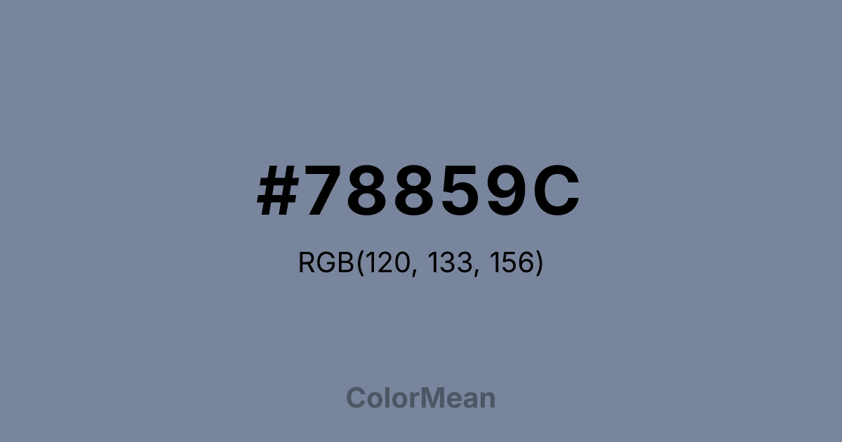 #78859C RGB value is (120, 133, 156). The hex color red value is 120, green is 133, and blue is 156. Its HSL format shows a hue of 218°, saturation of 15 percent, and lightness of 54 percent. The CMYK process values are 23 percent, 15 percent, 0 percent, 39 percent.