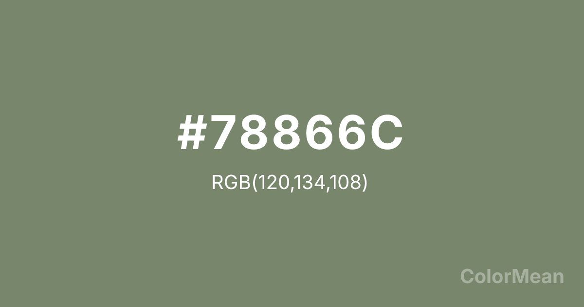 #78866C RGB value is (120, 134, 108). The hex color red value is 120, green is 134, and blue is 108. Its HSL format shows a hue of 92°, saturation of 11 percent, and lightness of 47 percent. The CMYK process values are 10 percent, 0 percent, 19 percent, 47 percent.
