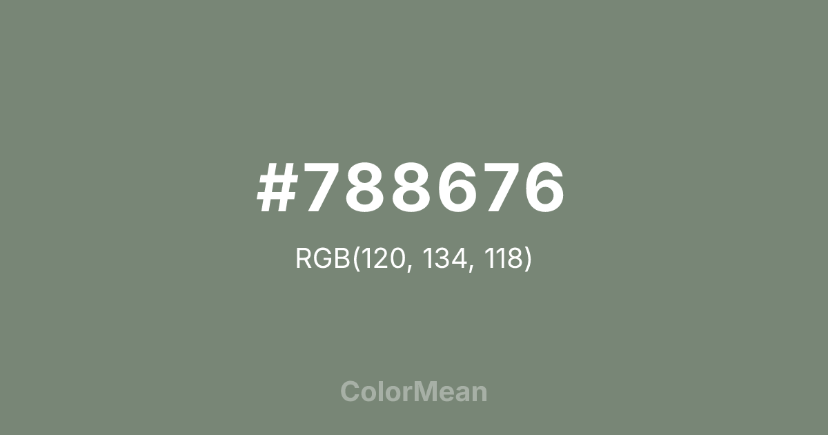#788676 RGB value is (120, 134, 118). The hex color red value is 120, green is 134, and blue is 118. Its HSL format shows a hue of 113°, saturation of 6 percent, and lightness of 49 percent. The CMYK process values are 10 percent, 0 percent, 12 percent, 47 percent.