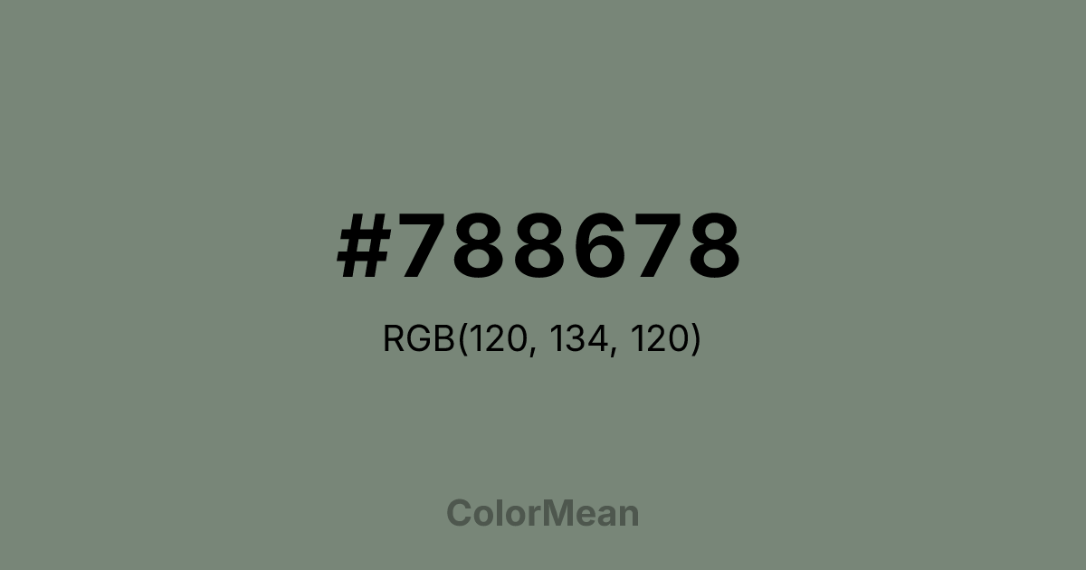 #788678 RGB value is (120, 134, 120). The hex color red value is 120, green is 134, and blue is 120. Its HSL format shows a hue of 120°, saturation of 6 percent, and lightness of 50 percent. The CMYK process values are 10 percent, 0 percent, 10 percent, 47 percent.