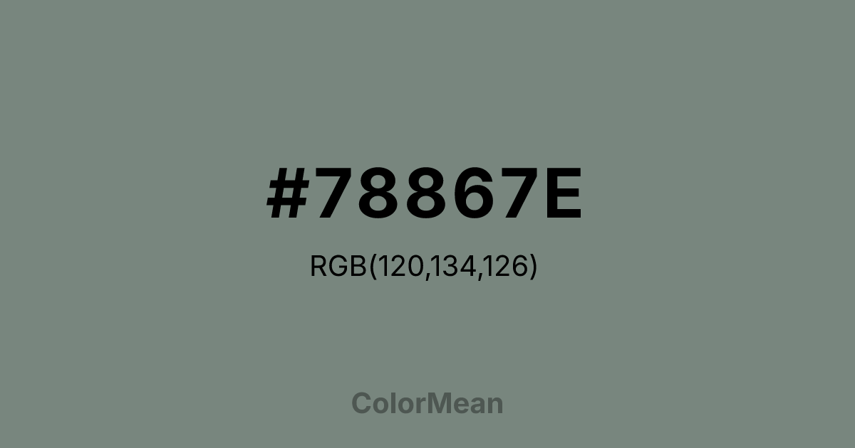 #78867E RGB value is (120, 134, 126). The hex color red value is 120, green is 134, and blue is 126. Its HSL format shows a hue of 146°, saturation of 6 percent, and lightness of 50 percent. The CMYK process values are 10 percent, 0 percent, 6 percent, 47 percent.