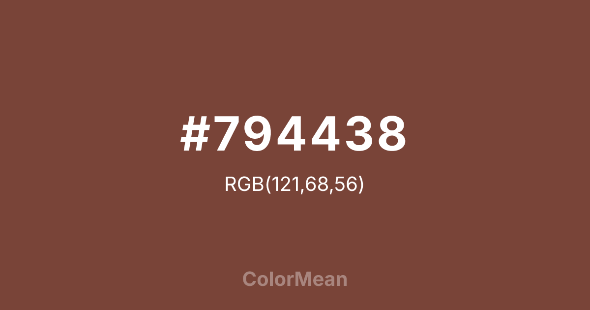 #794438 RGB value is (121, 68, 56). The hex color red value is 121, green is 68, and blue is 56. Its HSL format shows a hue of 11°, saturation of 37 percent, and lightness of 35 percent. The CMYK process values are 0 percent, 44 percent, 54 percent, 53 percent.