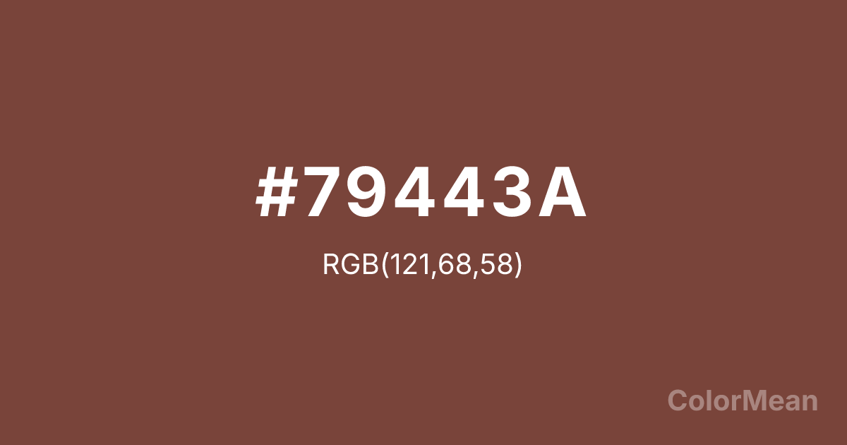 #79443A RGB value is (121, 68, 58). The hex color red value is 121, green is 68, and blue is 58. Its HSL format shows a hue of 10°, saturation of 35 percent, and lightness of 35 percent. The CMYK process values are 0 percent, 44 percent, 52 percent, 53 percent.
