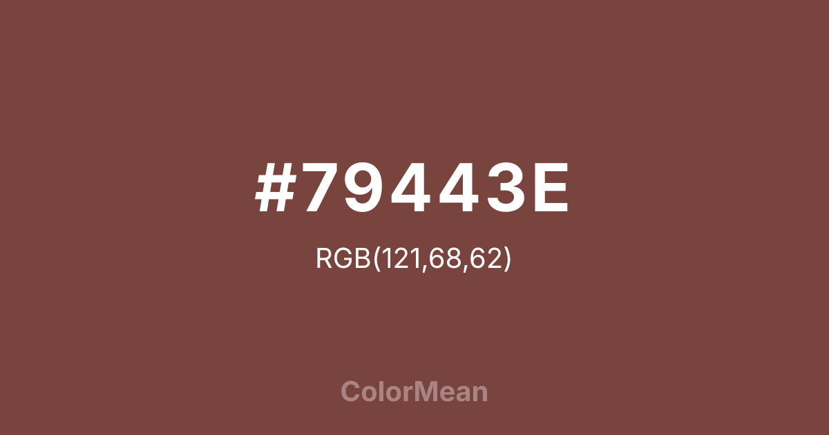 #79443E RGB value is (121, 68, 62). The hex color red value is 121, green is 68, and blue is 62. Its HSL format shows a hue of 6°, saturation of 32 percent, and lightness of 36 percent. The CMYK process values are 0 percent, 44 percent, 49 percent, 53 percent.