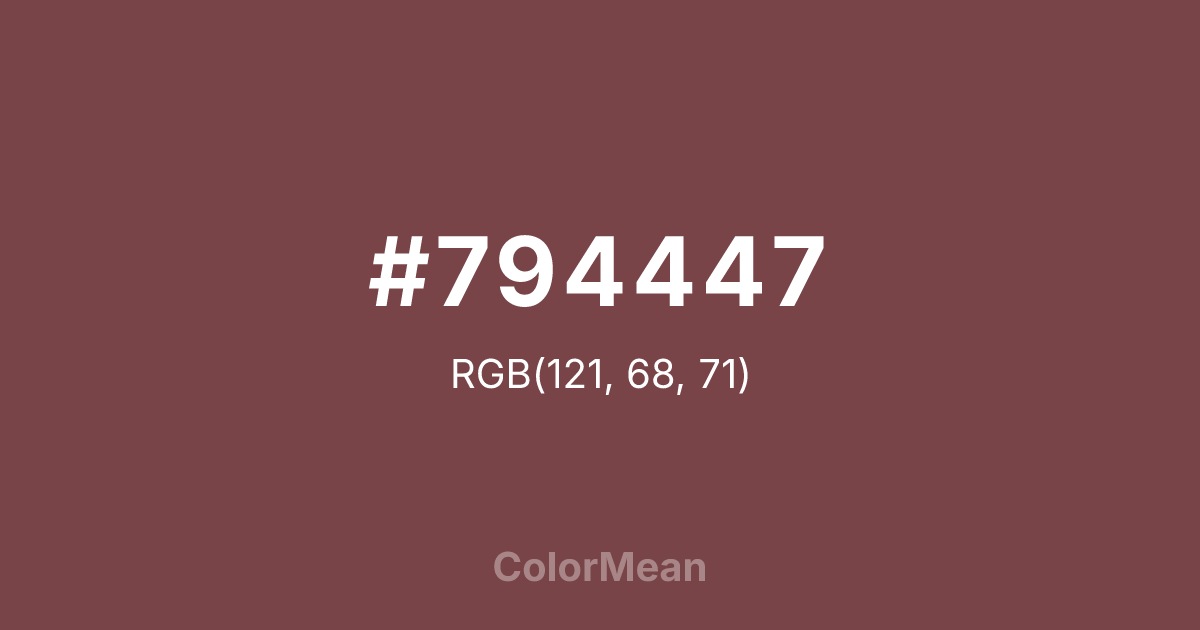 #794447 RGB value is (121, 68, 71). The hex color red value is 121, green is 68, and blue is 71. Its HSL format shows a hue of 357°, saturation of 28 percent, and lightness of 37 percent. The CMYK process values are 0 percent, 44 percent, 41 percent, 53 percent.