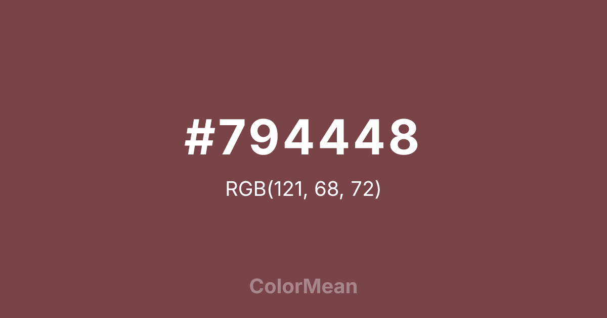 #794448 RGB value is (121, 68, 72). The hex color red value is 121, green is 68, and blue is 72. Its HSL format shows a hue of 355°, saturation of 28 percent, and lightness of 37 percent. The CMYK process values are 0 percent, 44 percent, 40 percent, 53 percent.