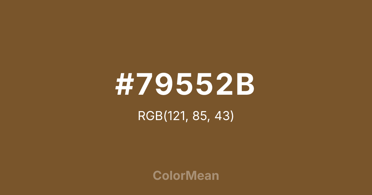 #79552B RGB value is (121, 85, 43). The hex color red value is 121, green is 85, and blue is 43. Its HSL format shows a hue of 32°, saturation of 48 percent, and lightness of 32 percent. The CMYK process values are 0 percent, 30 percent, 64 percent, 53 percent.