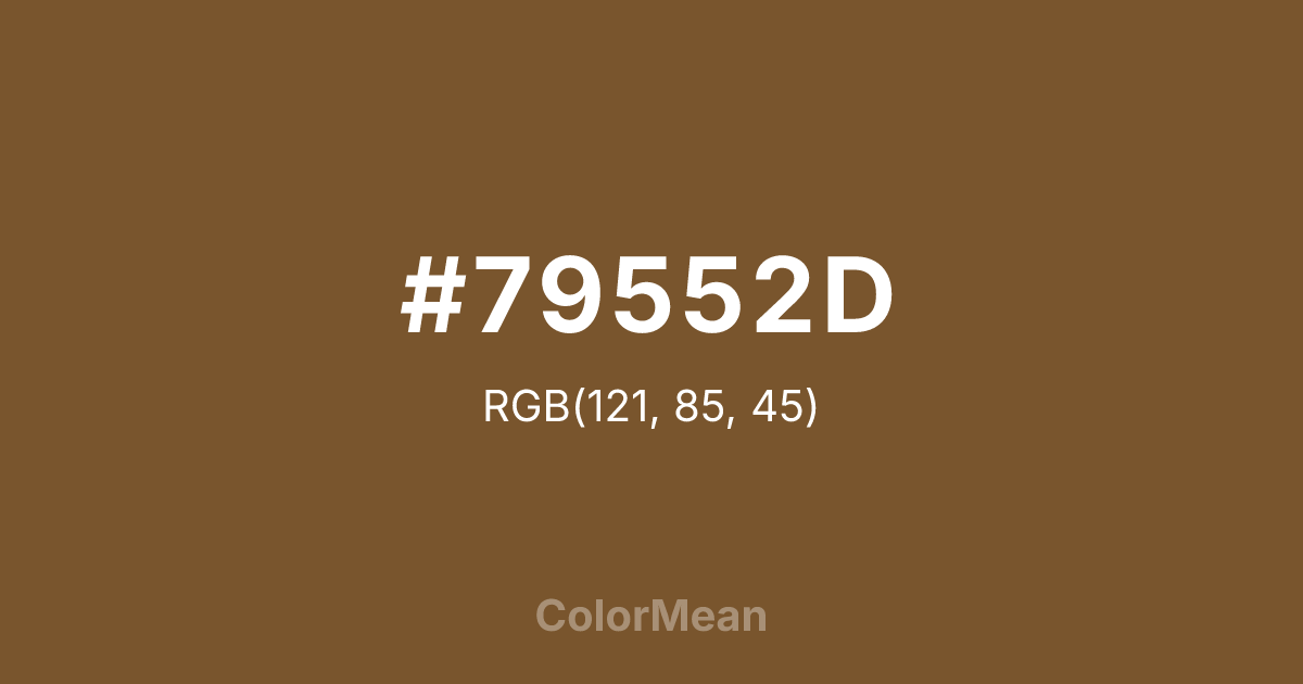 #79552D RGB value is (121, 85, 45). The hex color red value is 121, green is 85, and blue is 45. Its HSL format shows a hue of 32°, saturation of 46 percent, and lightness of 33 percent. The CMYK process values are 0 percent, 30 percent, 63 percent, 53 percent.