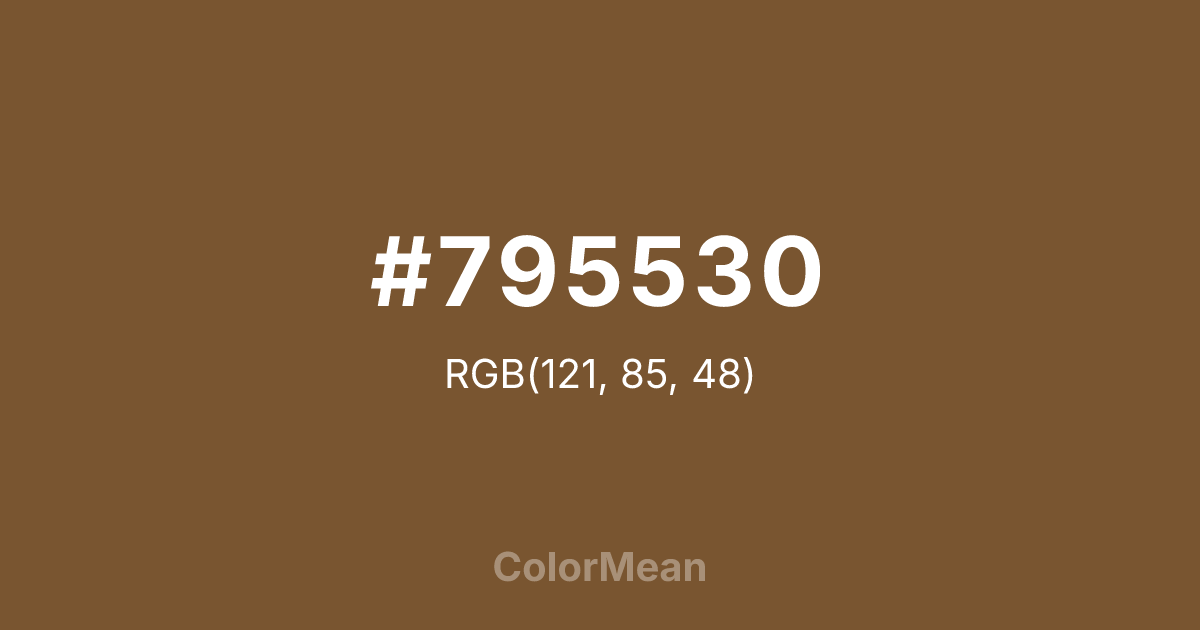 #795530 RGB value is (121, 85, 48). The hex color red value is 121, green is 85, and blue is 48. Its HSL format shows a hue of 30°, saturation of 43 percent, and lightness of 33 percent. The CMYK process values are 0 percent, 30 percent, 60 percent, 53 percent.