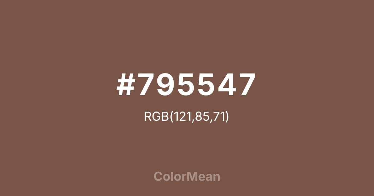 #795547 RGB value is (121, 85, 71). The hex color red value is 121, green is 85, and blue is 71. Its HSL format shows a hue of 17°, saturation of 26 percent, and lightness of 38 percent. The CMYK process values are 0 percent, 30 percent, 41 percent, 53 percent.