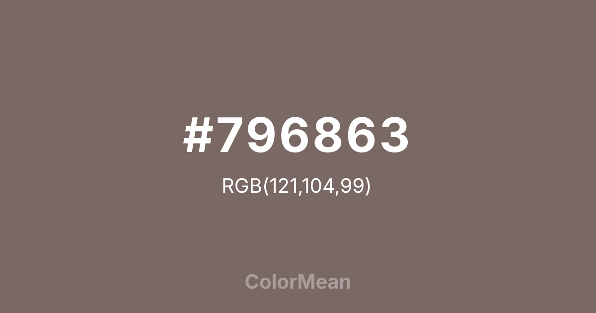 #796863 RGB value is (121, 104, 99). The hex color red value is 121, green is 104, and blue is 99. Its HSL format shows a hue of 14°, saturation of 10 percent, and lightness of 43 percent. The CMYK process values are 0 percent, 14 percent, 18 percent, 53 percent.