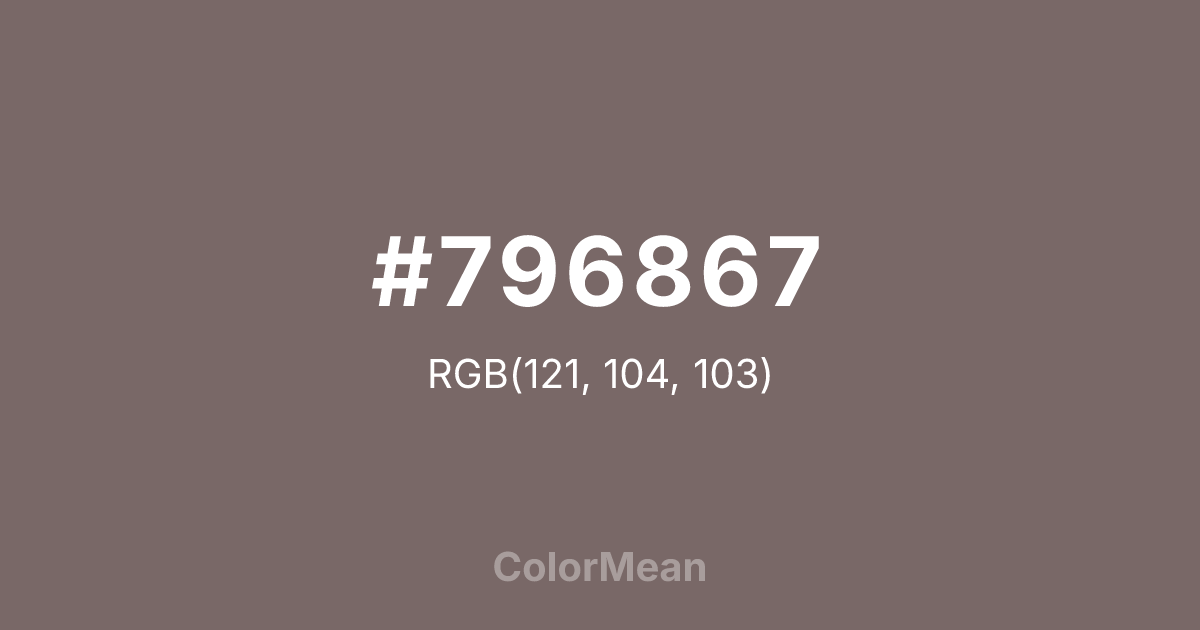 #796867 RGB value is (121, 104, 103). The hex color red value is 121, green is 104, and blue is 103. Its HSL format shows a hue of 3°, saturation of 8 percent, and lightness of 44 percent. The CMYK process values are 0 percent, 14 percent, 15 percent, 53 percent.