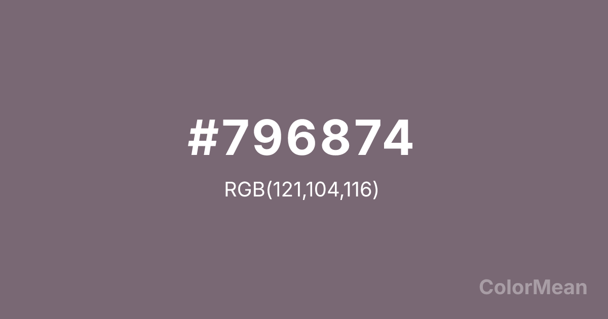 #796874 RGB value is (121, 104, 116). The hex color red value is 121, green is 104, and blue is 116. Its HSL format shows a hue of 318°, saturation of 8 percent, and lightness of 44 percent. The CMYK process values are 0 percent, 14 percent, 4 percent, 53 percent.