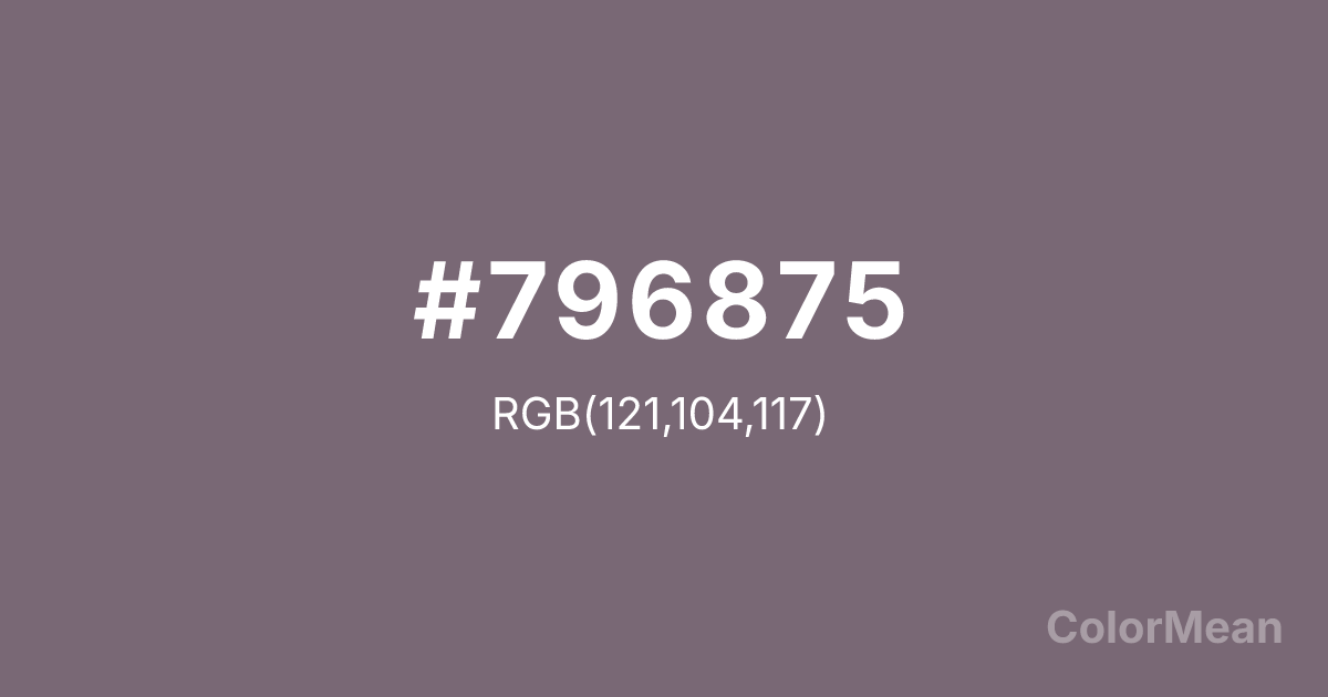 #796875 RGB value is (121, 104, 117). The hex color red value is 121, green is 104, and blue is 117. Its HSL format shows a hue of 314°, saturation of 8 percent, and lightness of 44 percent. The CMYK process values are 0 percent, 14 percent, 3 percent, 53 percent.
