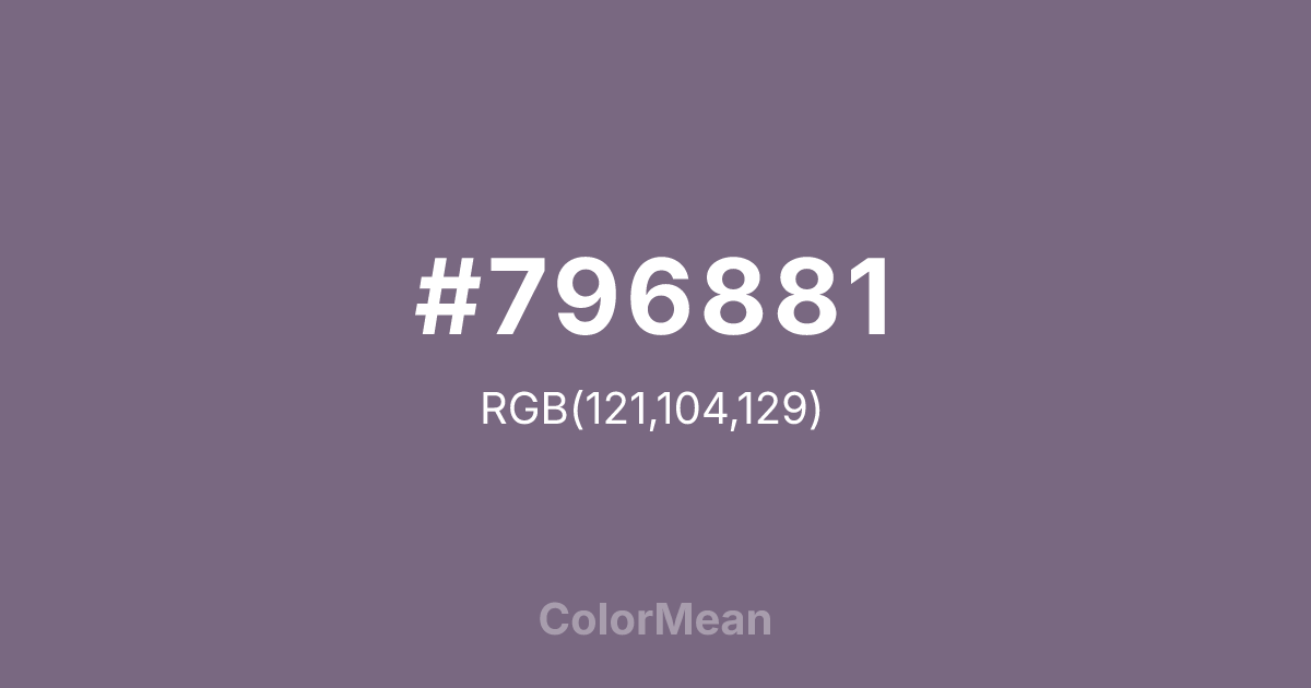 #796881 RGB value is (121, 104, 129). The hex color red value is 121, green is 104, and blue is 129. Its HSL format shows a hue of 281°, saturation of 11 percent, and lightness of 46 percent. The CMYK process values are 6 percent, 19 percent, 0 percent, 49 percent.