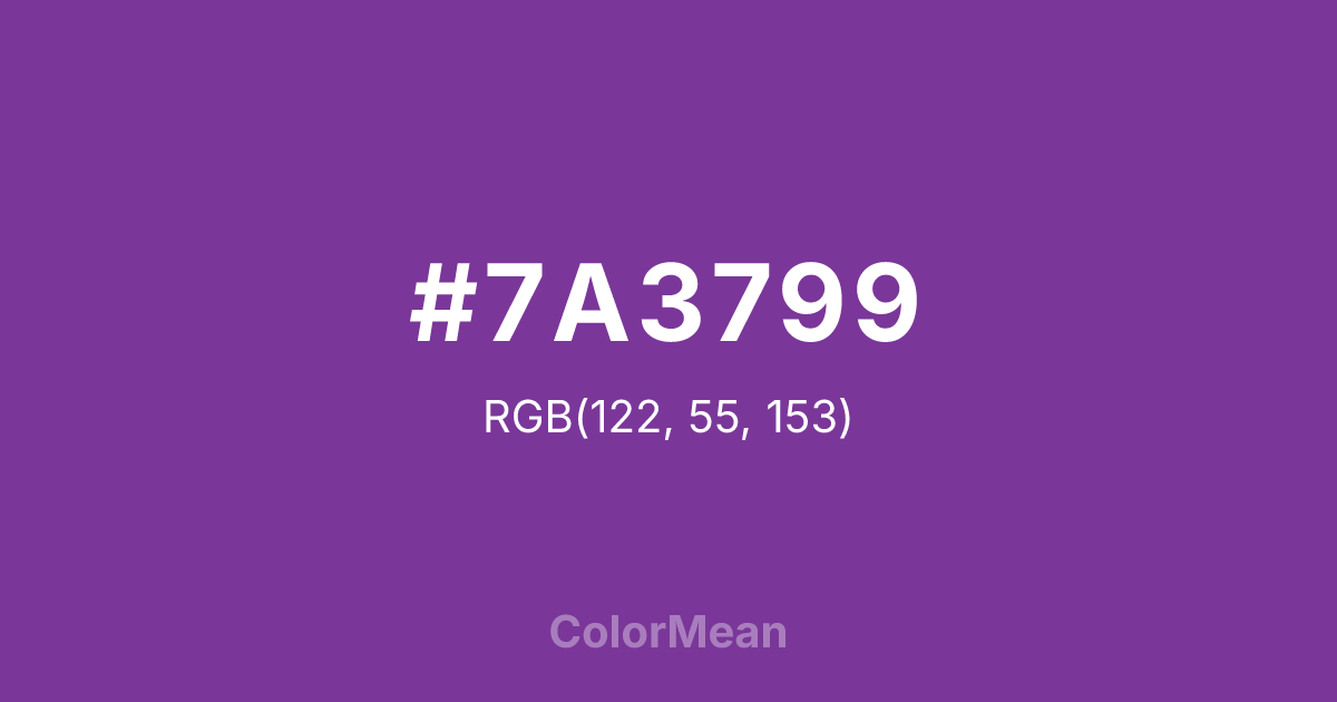 #7A3799 RGB value is (122, 55, 153). The hex color red value is 122, green is 55, and blue is 153. Its HSL format shows a hue of 281°, saturation of 47 percent, and lightness of 41 percent. The CMYK process values are 20 percent, 64 percent, 0 percent, 40 percent.