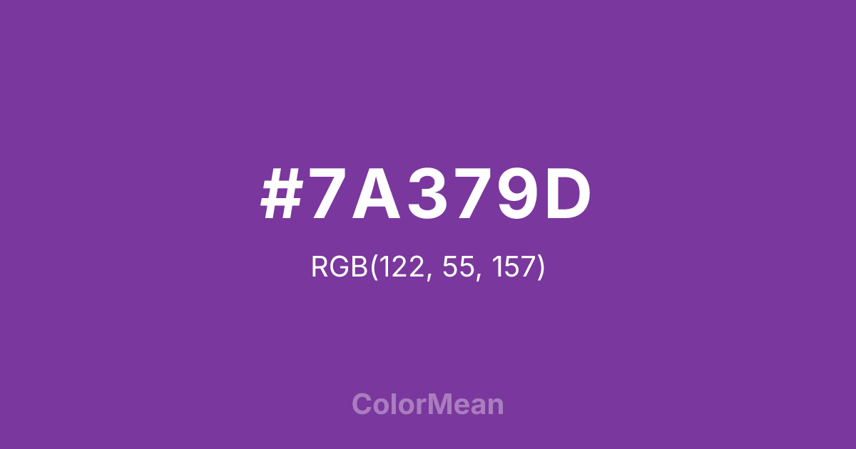 #7A379D RGB value is (122, 55, 157). The hex color red value is 122, green is 55, and blue is 157. Its HSL format shows a hue of 279°, saturation of 48 percent, and lightness of 42 percent. The CMYK process values are 22 percent, 65 percent, 0 percent, 38 percent.