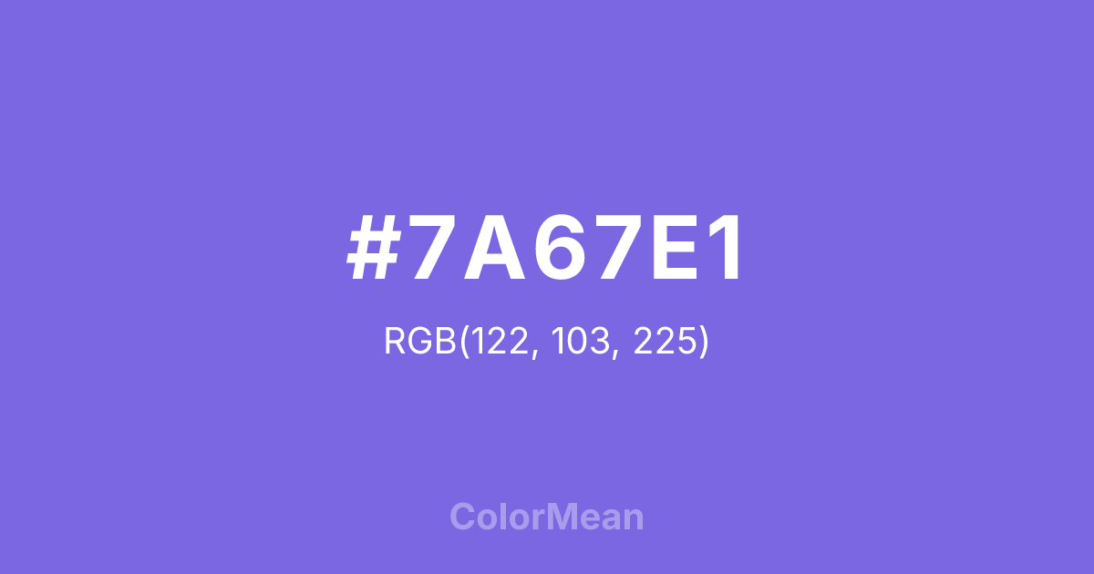 #7A67E1 RGB value is (122, 103, 225). The hex color red value is 122, green is 103, and blue is 225. Its HSL format shows a hue of 249°, saturation of 67 percent, and lightness of 64 percent. The CMYK process values are 46 percent, 54 percent, 0 percent, 12 percent.