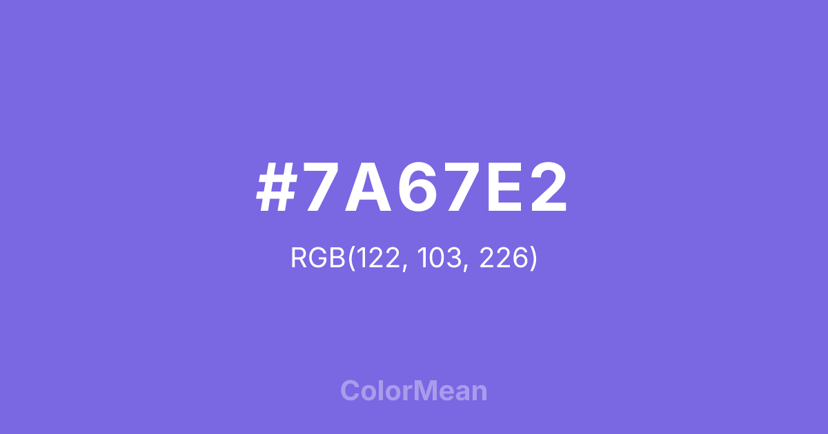 #7A67E2 RGB value is (122, 103, 226). The hex color red value is 122, green is 103, and blue is 226. Its HSL format shows a hue of 249°, saturation of 68 percent, and lightness of 65 percent. The CMYK process values are 46 percent, 54 percent, 0 percent, 11 percent.