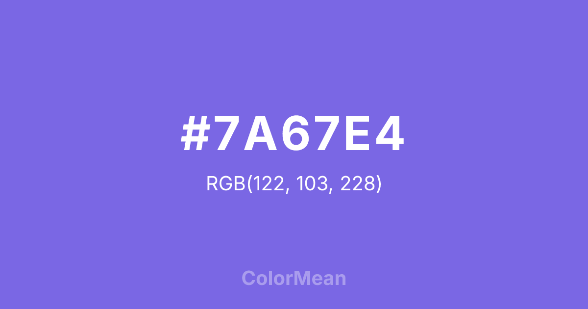 #7A67E4 RGB value is (122, 103, 228). The hex color red value is 122, green is 103, and blue is 228. Its HSL format shows a hue of 249°, saturation of 70 percent, and lightness of 65 percent. The CMYK process values are 46 percent, 55 percent, 0 percent, 11 percent.