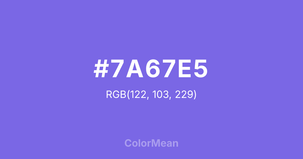 #7A67E5 RGB value is (122, 103, 229). The hex color red value is 122, green is 103, and blue is 229. Its HSL format shows a hue of 249°, saturation of 71 percent, and lightness of 65 percent. The CMYK process values are 47 percent, 55 percent, 0 percent, 10 percent.