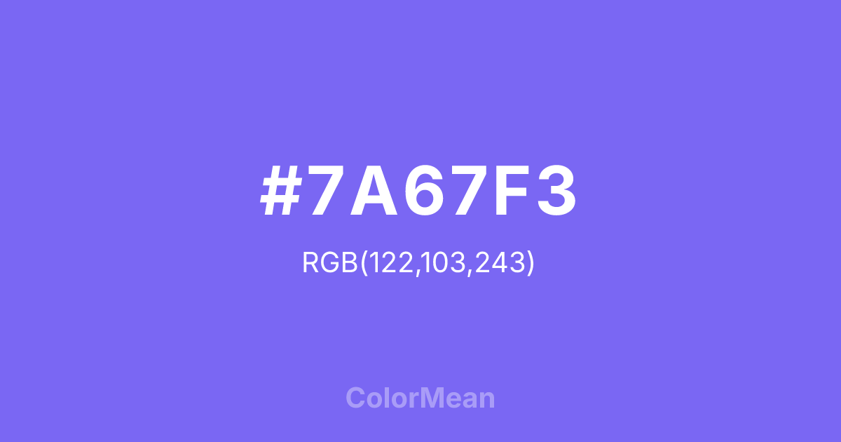 #7A67F3 RGB value is (122, 103, 243). The hex color red value is 122, green is 103, and blue is 243. Its HSL format shows a hue of 248°, saturation of 85 percent, and lightness of 68 percent. The CMYK process values are 50 percent, 58 percent, 0 percent, 5 percent.