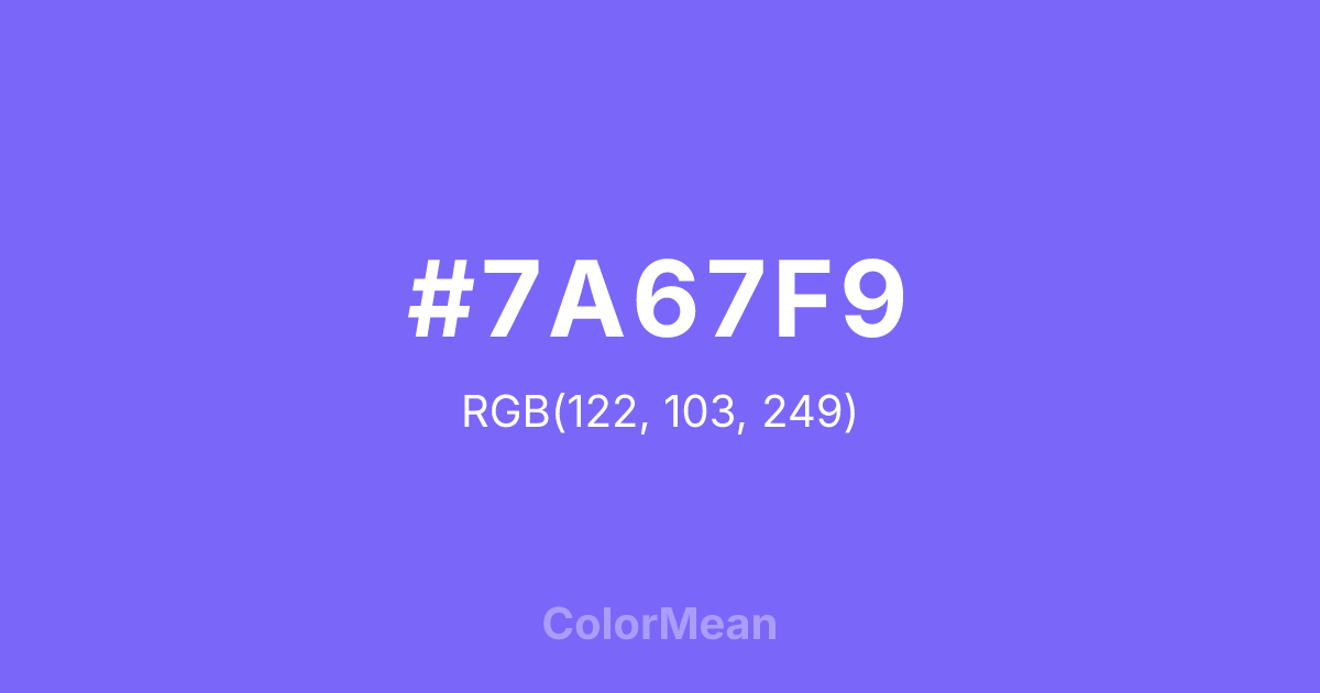 #7A67F9 RGB value is (122, 103, 249). The hex color red value is 122, green is 103, and blue is 249. Its HSL format shows a hue of 248°, saturation of 92 percent, and lightness of 69 percent. The CMYK process values are 51 percent, 59 percent, 0 percent, 2 percent.