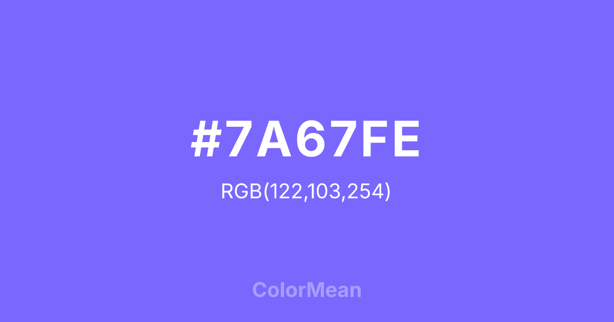 #7A67FE RGB value is (122, 103, 254). The hex color red value is 122, green is 103, and blue is 254. Its HSL format shows a hue of 248°, saturation of 99 percent, and lightness of 70 percent. The CMYK process values are 52 percent, 59 percent, 0 percent, 0 percent.