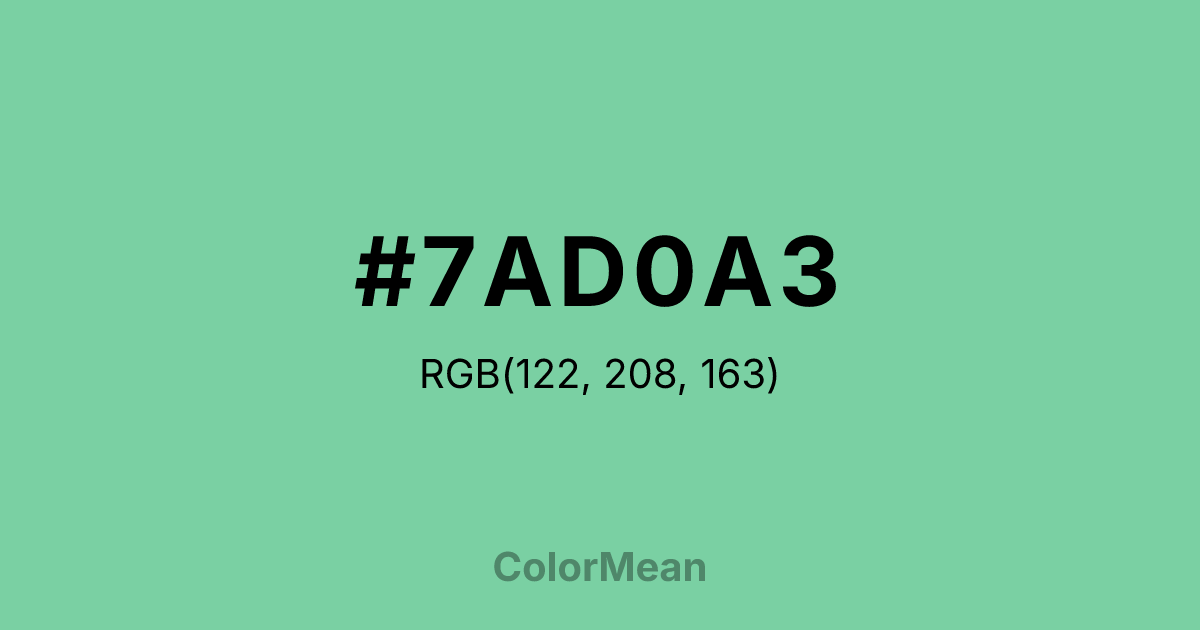 #7AD0A3 RGB value is (122, 208, 163). The hex color red value is 122, green is 208, and blue is 163. Its HSL format shows a hue of 149°, saturation of 48 percent, and lightness of 65 percent. The CMYK process values are 41 percent, 0 percent, 22 percent, 18 percent.