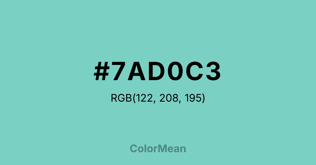 #7AD0C3 RGB value is (122, 208, 195). The hex color red value is 122, green is 208, and blue is 195. Its HSL format shows a hue of 171°, saturation of 48 percent, and lightness of 65 percent. The CMYK process values are 41 percent, 0 percent, 6 percent, 18 percent.