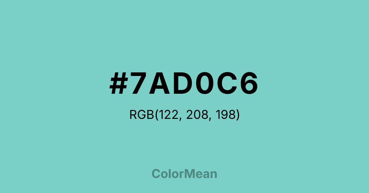 #7AD0C6 RGB value is (122, 208, 198). The hex color red value is 122, green is 208, and blue is 198. Its HSL format shows a hue of 173°, saturation of 48 percent, and lightness of 65 percent. The CMYK process values are 41 percent, 0 percent, 5 percent, 18 percent.