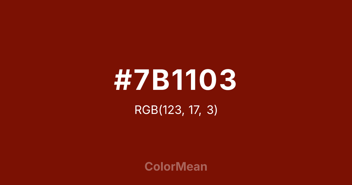 #7B1103 RGB value is (123, 17, 3). The hex color red value is 123, green is 17, and blue is 3. Its HSL format shows a hue of 7°, saturation of 95 percent, and lightness of 25 percent. The CMYK process values are 0 percent, 86 percent, 98 percent, 52 percent.