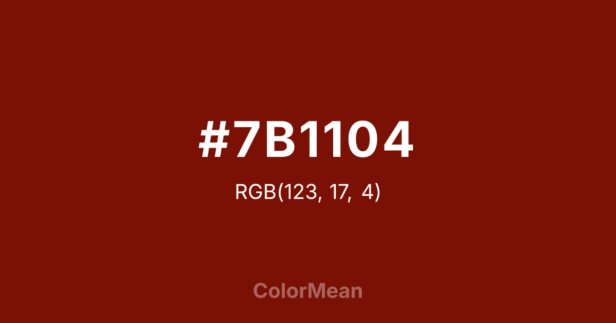 #7B1104 RGB value is (123, 17, 4). The hex color red value is 123, green is 17, and blue is 4. Its HSL format shows a hue of 7°, saturation of 94 percent, and lightness of 25 percent. The CMYK process values are 0 percent, 86 percent, 97 percent, 52 percent.