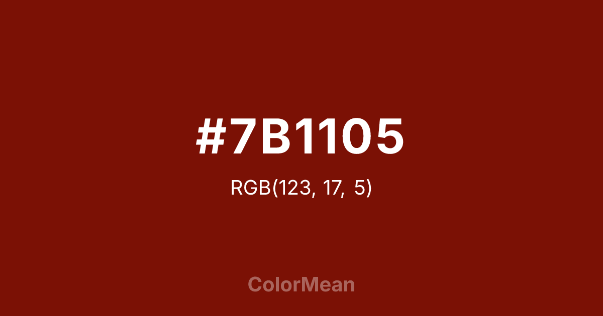 #7B1105 RGB value is (123, 17, 5). The hex color red value is 123, green is 17, and blue is 5. Its HSL format shows a hue of 6°, saturation of 92 percent, and lightness of 25 percent. The CMYK process values are 0 percent, 86 percent, 96 percent, 52 percent.