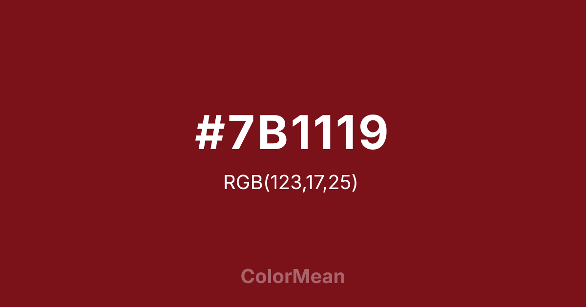 #7B1119 RGB value is (123, 17, 25). The hex color red value is 123, green is 17, and blue is 25. Its HSL format shows a hue of 355°, saturation of 76 percent, and lightness of 27 percent. The CMYK process values are 0 percent, 86 percent, 80 percent, 52 percent.