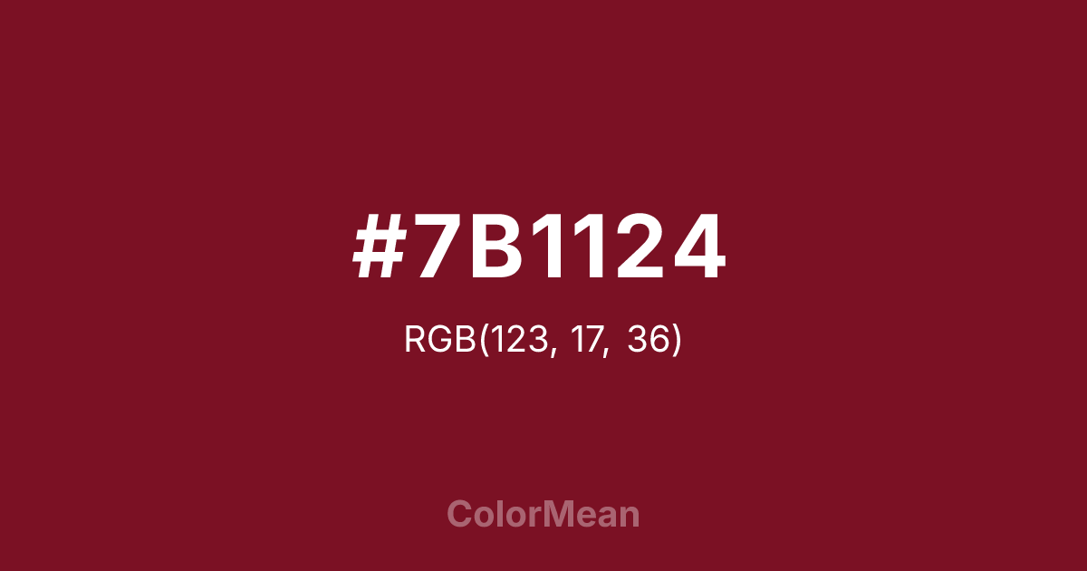 #7B1124 RGB value is (123, 17, 36). The hex color red value is 123, green is 17, and blue is 36. Its HSL format shows a hue of 349°, saturation of 76 percent, and lightness of 27 percent. The CMYK process values are 0 percent, 86 percent, 71 percent, 52 percent.