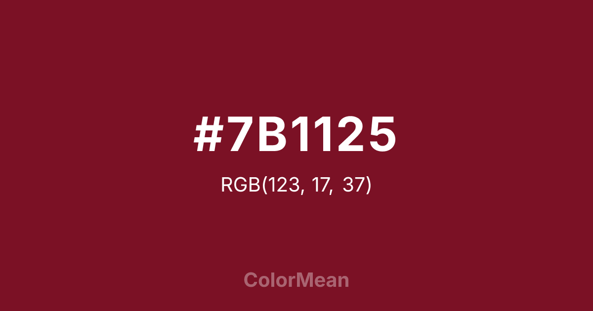 #7B1125 RGB value is (123, 17, 37). The hex color red value is 123, green is 17, and blue is 37. Its HSL format shows a hue of 349°, saturation of 76 percent, and lightness of 27 percent. The CMYK process values are 0 percent, 86 percent, 70 percent, 52 percent.