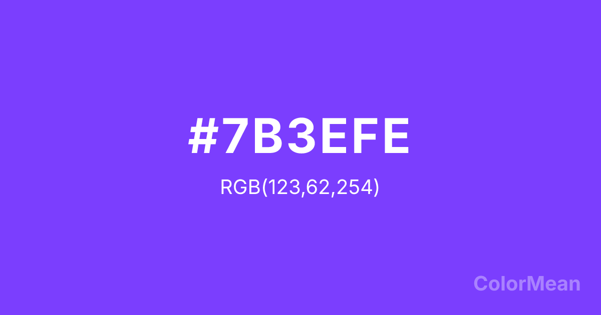 #7B3EFE RGB value is (123, 62, 254). The hex color red value is 123, green is 62, and blue is 254. Its HSL format shows a hue of 259°, saturation of 99 percent, and lightness of 62 percent. The CMYK process values are 52 percent, 76 percent, 0 percent, 0 percent.