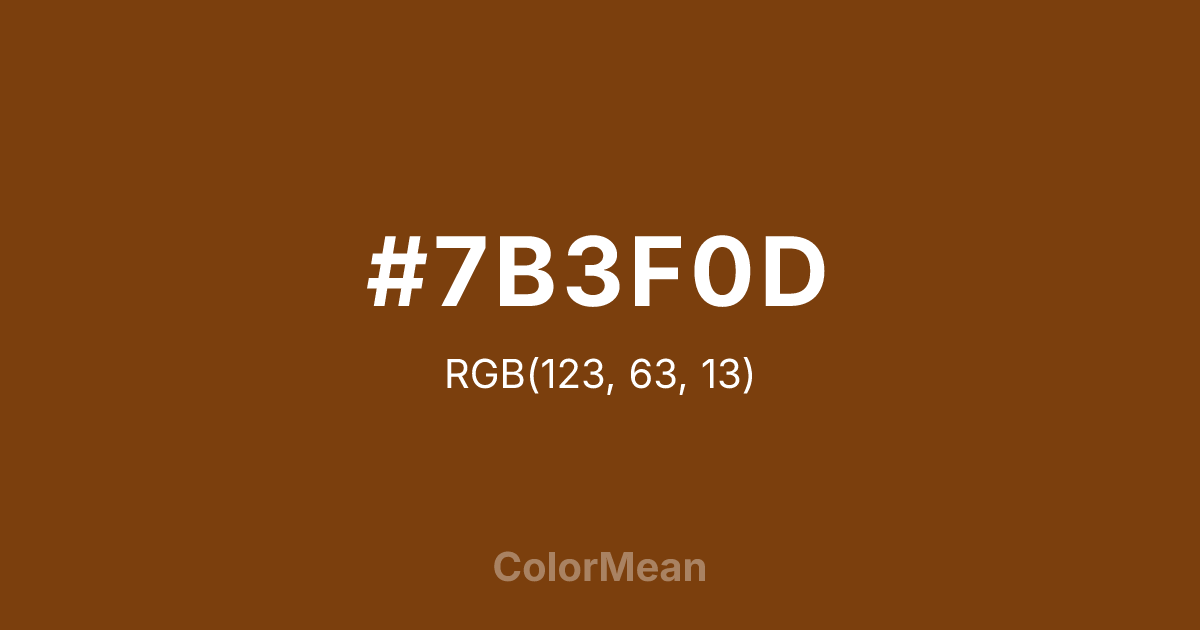 #7B3F0D RGB value is (123, 63, 13). The hex color red value is 123, green is 63, and blue is 13. Its HSL format shows a hue of 27°, saturation of 81 percent, and lightness of 27 percent. The CMYK process values are 0 percent, 49 percent, 89 percent, 52 percent.