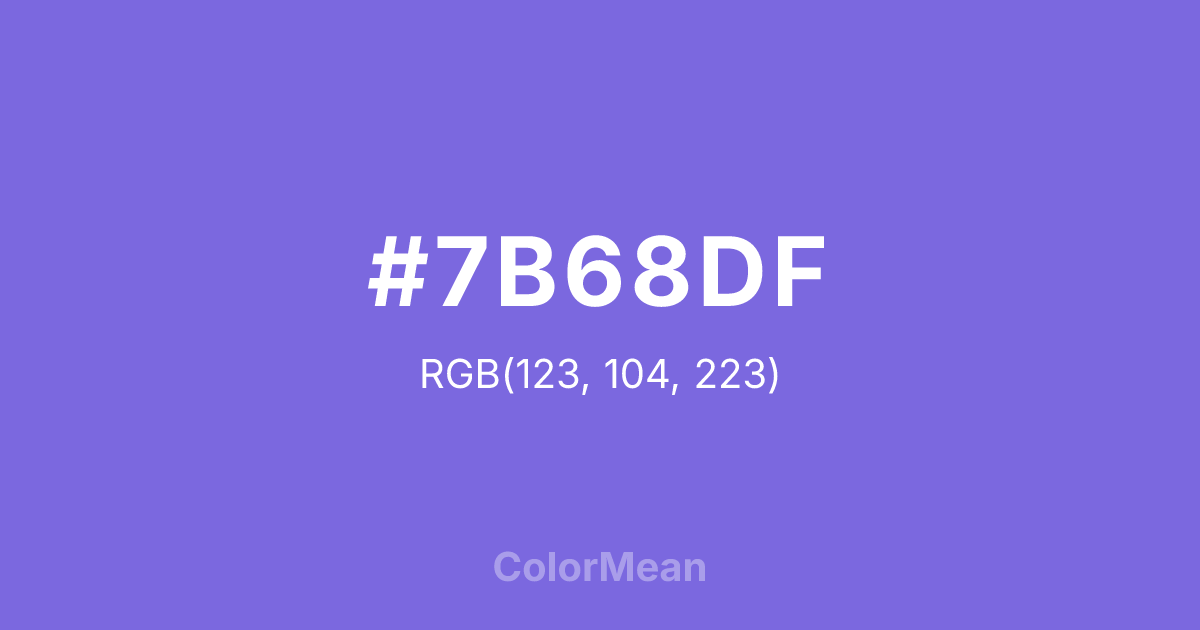 #7B68DF RGB value is (123, 104, 223). The hex color red value is 123, green is 104, and blue is 223. Its HSL format shows a hue of 250°, saturation of 65 percent, and lightness of 64 percent. The CMYK process values are 45 percent, 53 percent, 0 percent, 13 percent.