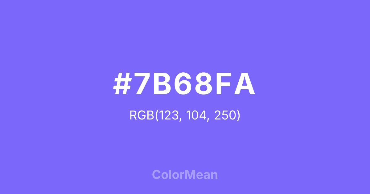 #7B68FA RGB value is (123, 104, 250). The hex color red value is 123, green is 104, and blue is 250. Its HSL format shows a hue of 248°, saturation of 94 percent, and lightness of 69 percent. The CMYK process values are 51 percent, 58 percent, 0 percent, 2 percent.