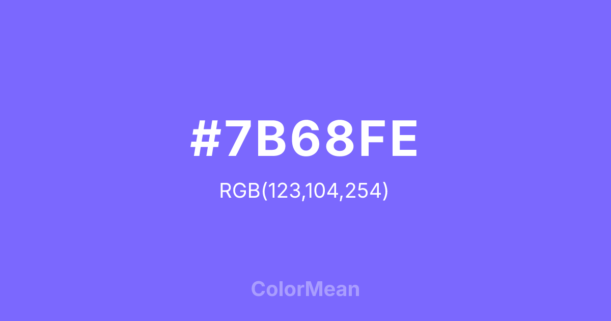 #7B68FE RGB value is (123, 104, 254). The hex color red value is 123, green is 104, and blue is 254. Its HSL format shows a hue of 248°, saturation of 99 percent, and lightness of 70 percent. The CMYK process values are 52 percent, 59 percent, 0 percent, 0 percent.