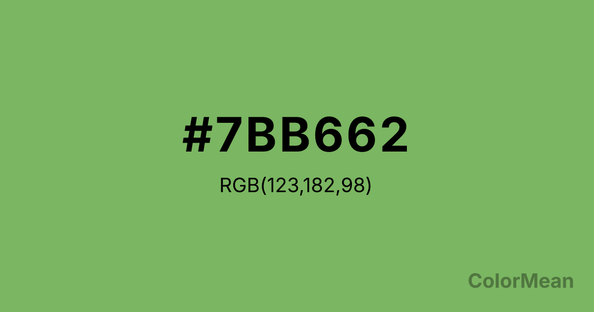 #7BB662 RGB value is (123, 182, 98). The hex color red value is 123, green is 182, and blue is 98. Its HSL format shows a hue of 102°, saturation of 37 percent, and lightness of 55 percent. The CMYK process values are 32 percent, 0 percent, 46 percent, 29 percent.