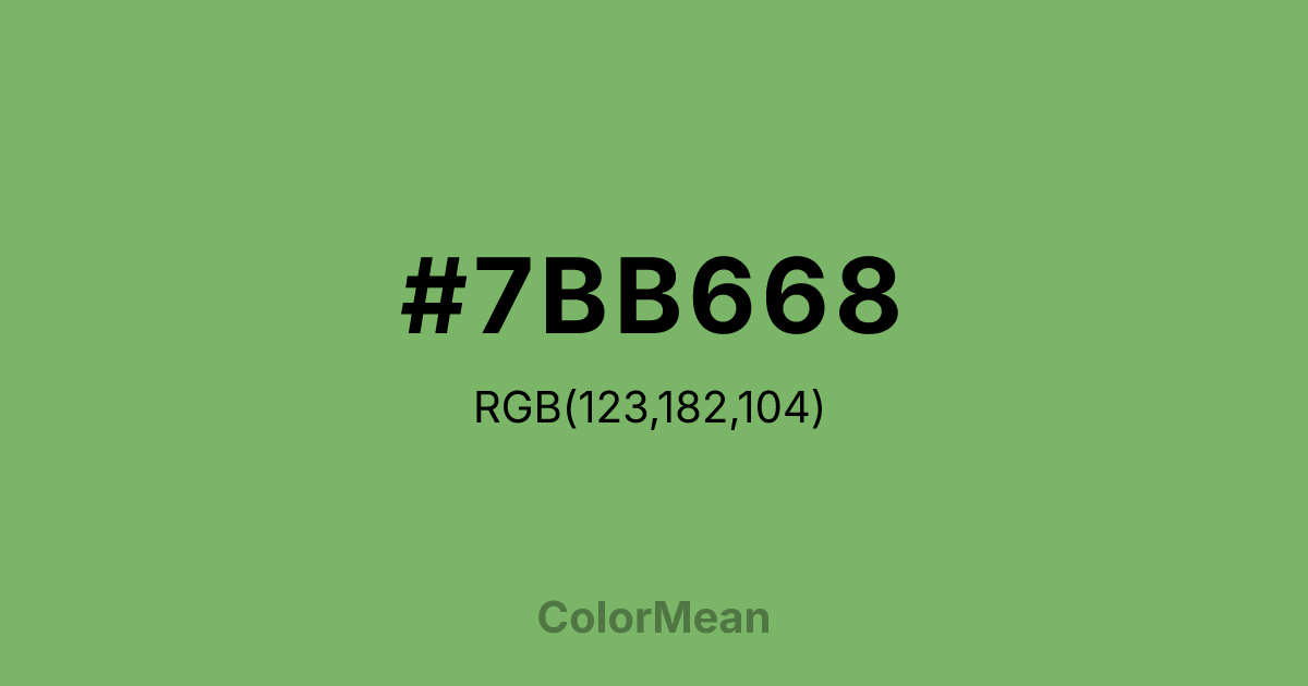 #7BB668 RGB value is (123, 182, 104). The hex color red value is 123, green is 182, and blue is 104. Its HSL format shows a hue of 105°, saturation of 35 percent, and lightness of 56 percent. The CMYK process values are 32 percent, 0 percent, 43 percent, 29 percent.